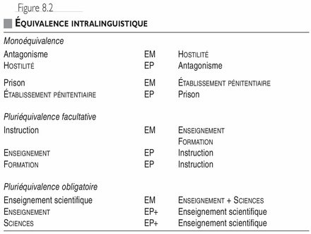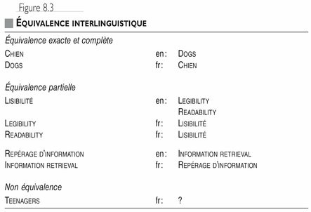 Ces relations sont * l’équivalence intralinguistique entre termes représentant le même concept dans une même langue naturelle (donc entre synonymes) * l’équivalence interlinguistique entre termes représentant un même concept dans deux ou plusieurs langues naturelles * la hiérarchie * l’association
